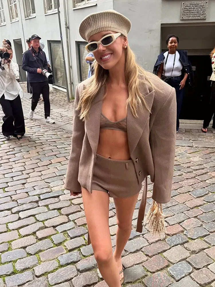 This short set offers versatility, suitable for various occasions from beach days to city strolls.
